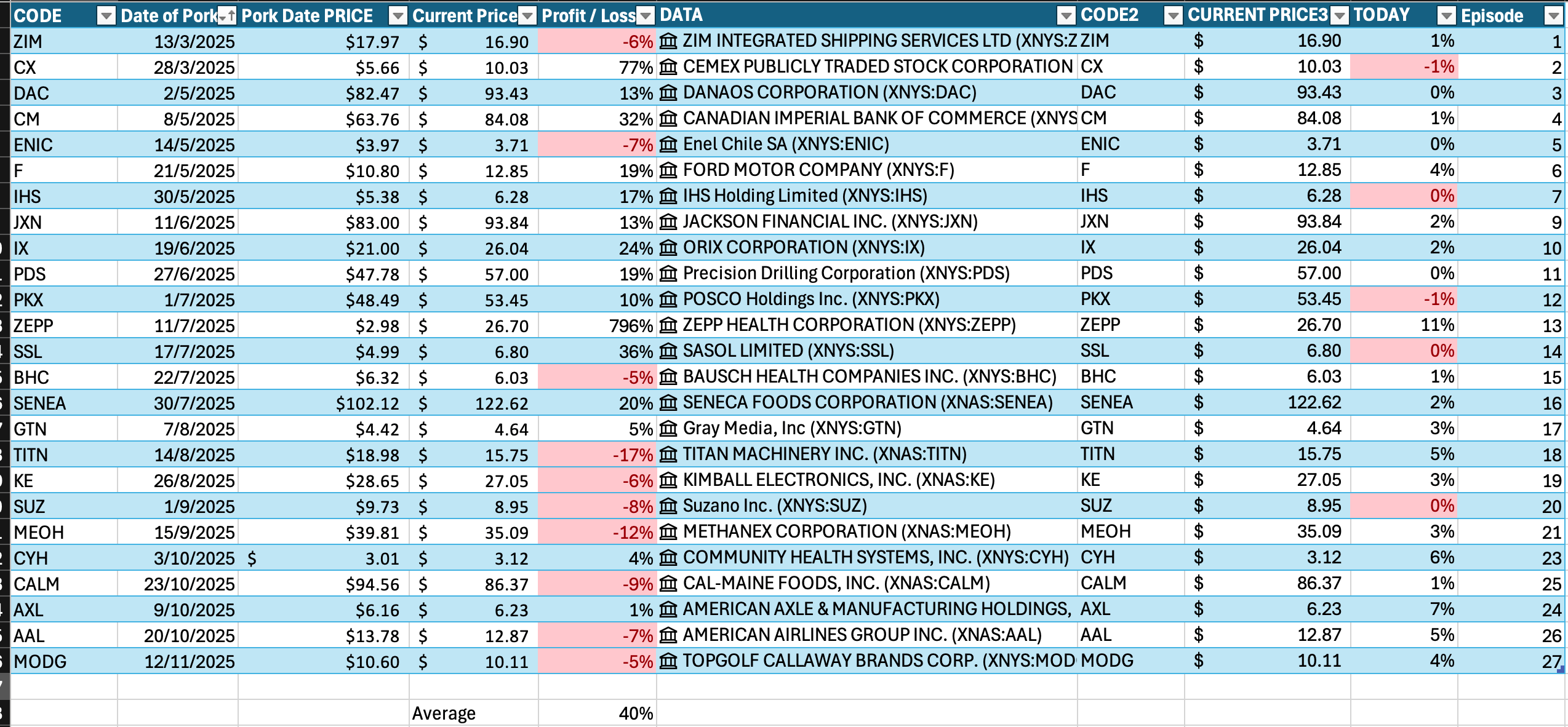 You just go out there, plays golf for you. It’ll be fantastic. You’ll love it. Uh, so American Airlines we talked about a couple of weeks ago, it’s down 10%. Um, American Axle is down 1%. Cal [00:04:00] Main Foods is down seven. Community health is stable. Methodex is down 10. Um, Titan Machinery is down 19. But outside of that, we’ve got quite a few winners.